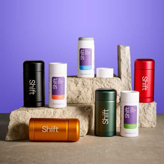 Shift deodorants are made with 100% natural ingredients and essential oils, chosen for their moisturising and moisture absorbing properties. We carefully selected ingredients kind to your skin, so that even with sensitive skin, Shift deodorant performs.