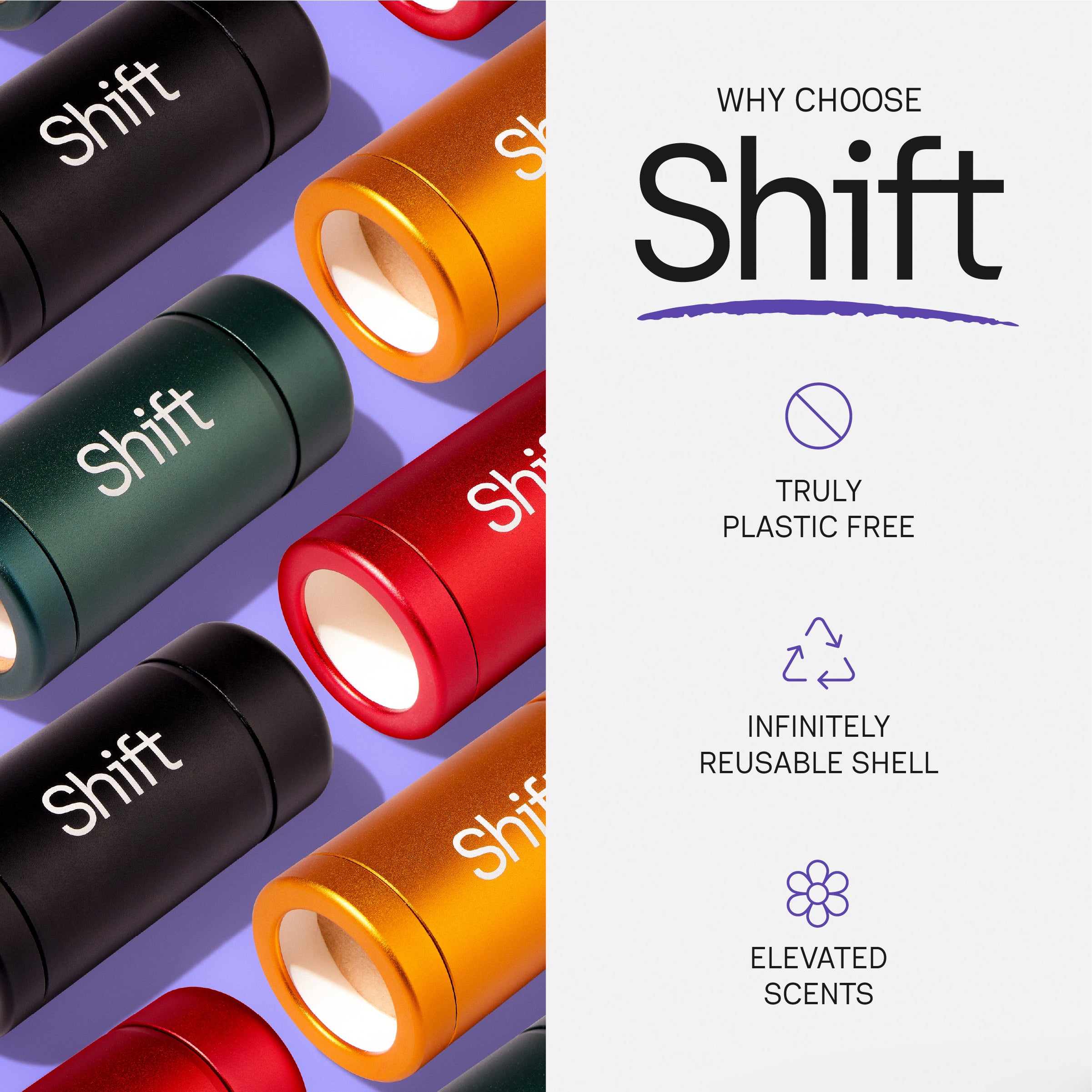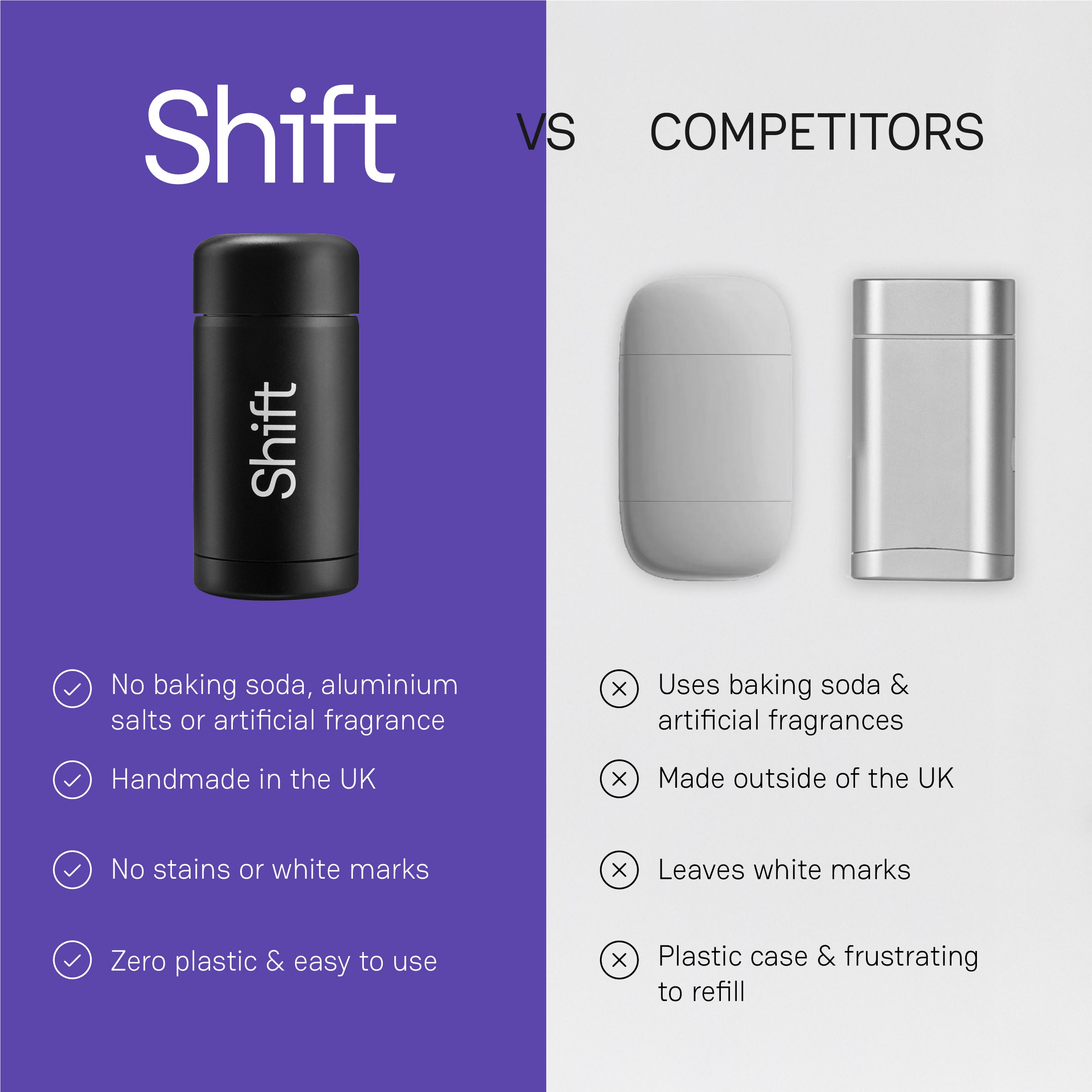 Shift deodorants are made with 100% natural ingredients and essential oils, chosen for their moisturising and moisture absorbing properties. We carefully selected ingredients kind to your skin, so that even with sensitive skin, Shift deodorant performs.